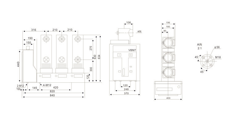 VS1(VBM7)-12型户内真空断路器外形安装尺寸: