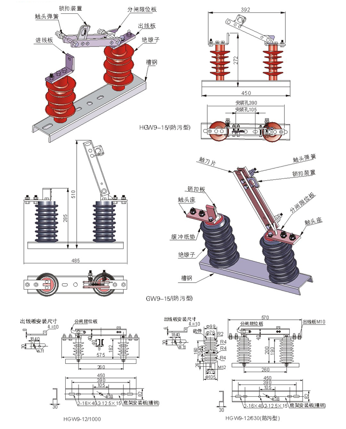 GW9、HGW9型户外交流高压隔离开关分合时用绝缘钩棒操作,闸刀合闸时本体带有自锁装置。本产品分为普通型和防污型两种。