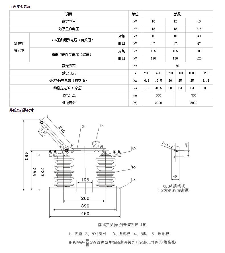 GW9-10/200A,GW9-10/400A,GW9-10/630A,GW9-10/1000A,GW9-10/1250A,GW9-10/15,HGW9-10/200A,HGW9-10/400A,HGW9-10/630A,HGW9-10/1000A,HGW9-10/1250A,HGW9-10/15系列户外单极隔离开关,是交流50H的户外装置,用于频率为50HZ、10kV供电网中,供高压线路在有电压无负载情况下进行换接,以及对被检修的高压母线、断路器等电器设备与带电的高压线路进行电气隔离之用。也可用于分、合很小的电容电流和电感电流。GW9、HGW9型户外交流高压隔离开关供三相线路系统单相使用,其结构简单、经济、使用方便。