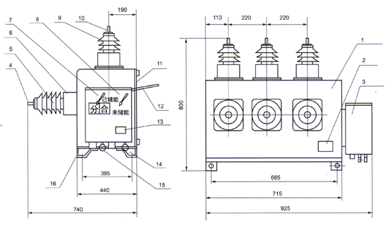 1、箱体 2、产品铭牌 3、操动机构 4、接线端字 5、绝缘子