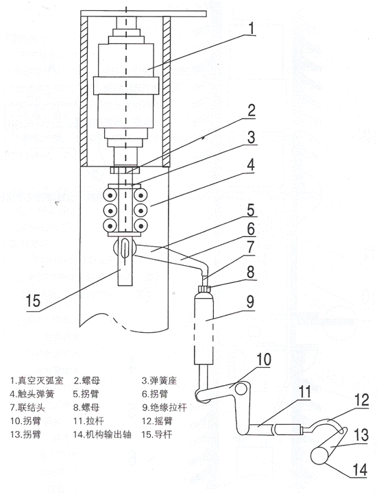 操作机构或分闸弹簧带动联杆,使绝缘拉杆9图3项11)上下运动,带动拐臂8及拐臂5绕轴转动,使得导杆7上下运动,实现灭弧室动触头进行,分合运动。