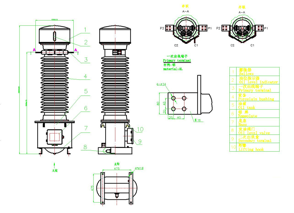7、为了保证其一次端子的机械强度与密封性能,其一次端子采用一次挤压成型设计,可靠的接触方式及增大接触面积,以减小接触电阻,避免局部过热。。