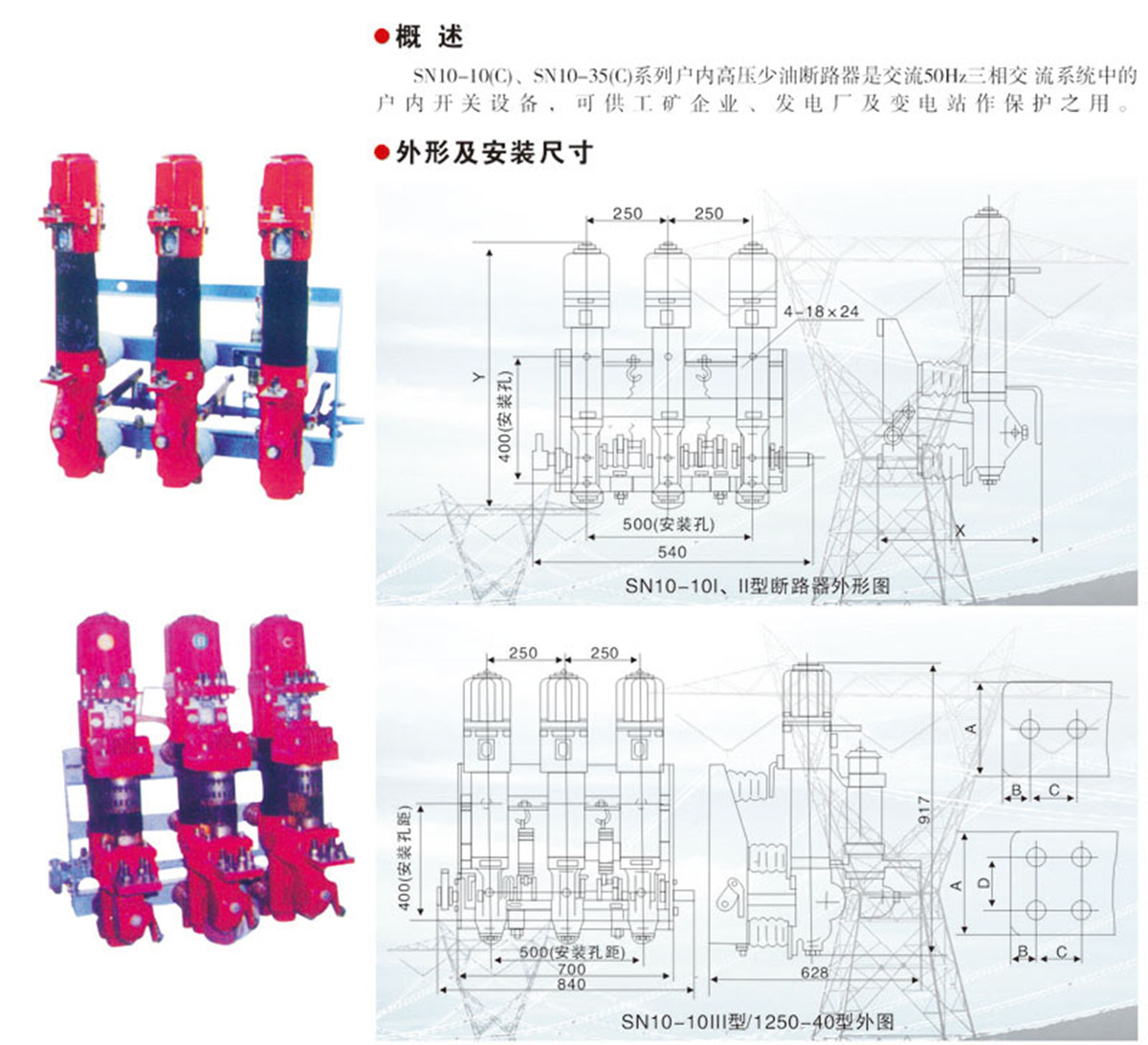 SN10-10系列少油断路器由框架,油箱及传动部分组成。框架上装有分闸限位器,合闸缓冲,分闸弹簧及6只支持绝缘子。传动部分有断路器主轴,绝缘拉杆等。油箱固定在支持绝缘子上。