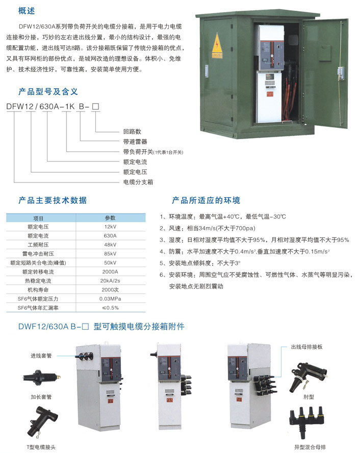 DFW 高压电缆分支箱带开关带环网柜型由乐清市吉电电气有限公司自主生产,在电力系统10kV配网电缆化工程中,以一种经济、可靠、维护方便的接线方式替代原配网架空线中大量的分支成为一大难题,而电缆分支箱的出现彻底解决了这个问题,并且以它全绝缘、全密封的特性而使线路故障率大为降低,成为配网电缆化工程的首选设备。其简单、方便、灵活的联接组合方式,使它在某些场合下,可代替环网柜;必要场合下,可埋在地下或浸于水中,节省了设备和电缆的投资,提高了供电的可靠性,广泛适用于商业中心、工业园区及城市密集区。电缆分支箱按照结构形式和电缆接头种类的不同可分为美式电缆分支箱、欧式电缆分支箱和带开关的电缆分支箱三种。