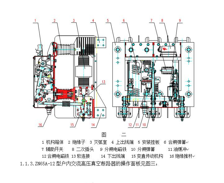 6. 操动机构:断路器操动机构为电动机通过两级蜗轮副传动带动贮能轴拉伸合闸簧贮能,传动平稳,噪音低。同时,可通过第二级蜗轮副手力贮能,结构简单,操作轻松。操动机构在使用中不须再加油润滑。